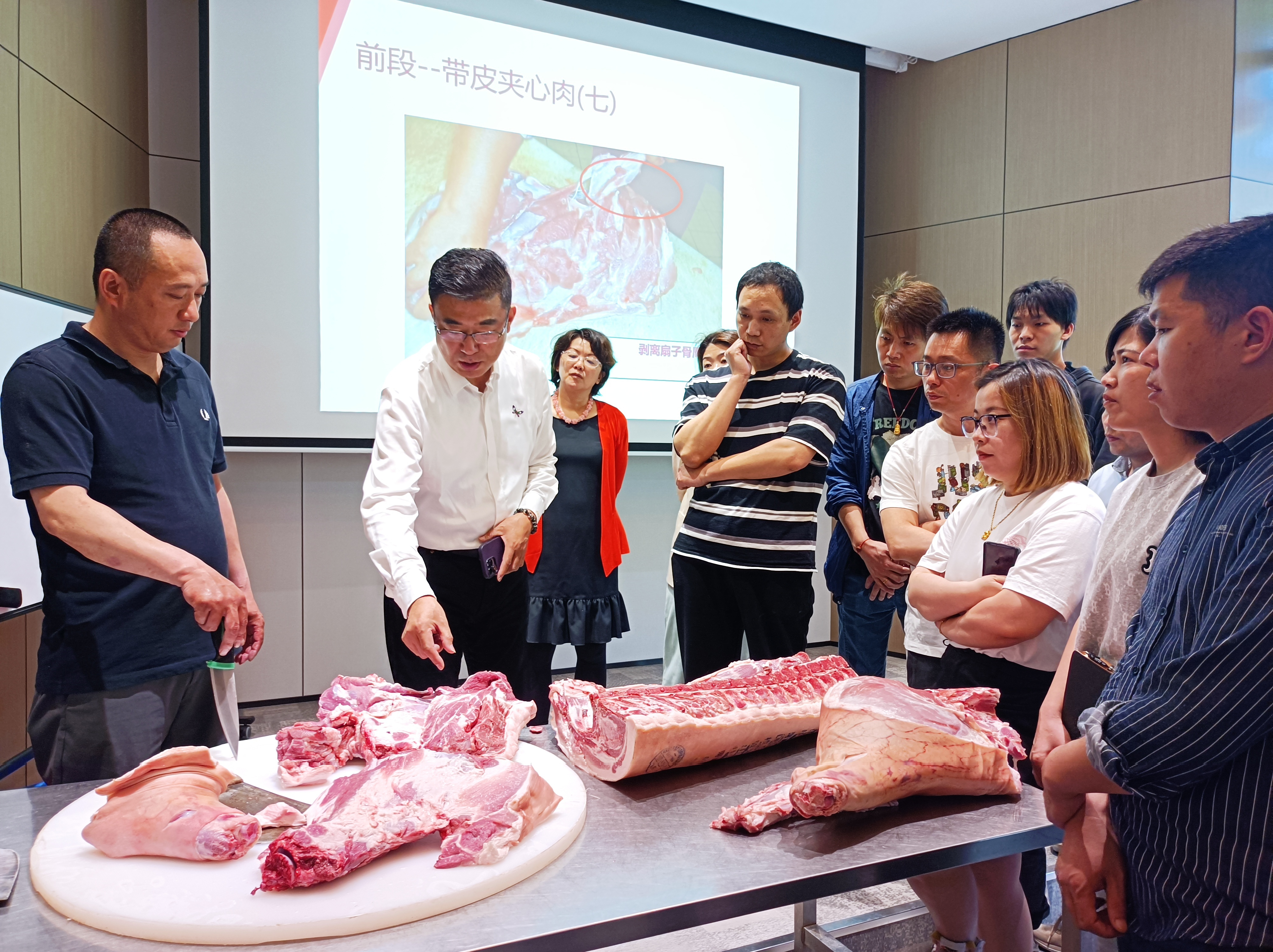 本次培訓(xùn)課程,歷時(shí)三個(gè)多小時(shí),分成上半場(chǎng)和下半場(chǎng),上半場(chǎng)以理論知識(shí)為主,通過講師系統(tǒng)化的專業(yè)知識(shí)介紹,讓學(xué)員們了解豬肉的產(chǎn)品種類、烹飪用途、產(chǎn)地特點(diǎn)、品質(zhì)鑒別技巧等。下半場(chǎng)則是真刀上手,實(shí)際操作,現(xiàn)場(chǎng)教學(xué),將半片白條豬進(jìn)行精準(zhǔn)分割,并進(jìn)行一定程度的修整,使產(chǎn)品更好滿足各類不同客戶的多元化烹飪需求。